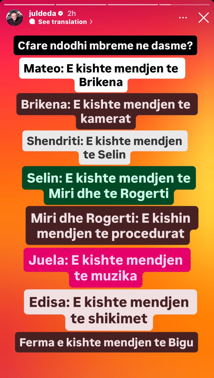 Në një InstaStory të fundit, ai ka ironizuar jo vetëm dasmën e Mateos dhe Brikenës, por edhe gjithë situatën rreth saj, duke bërë një “analizë” me humor për mënyrën si secili banor e përjetoi momentin.