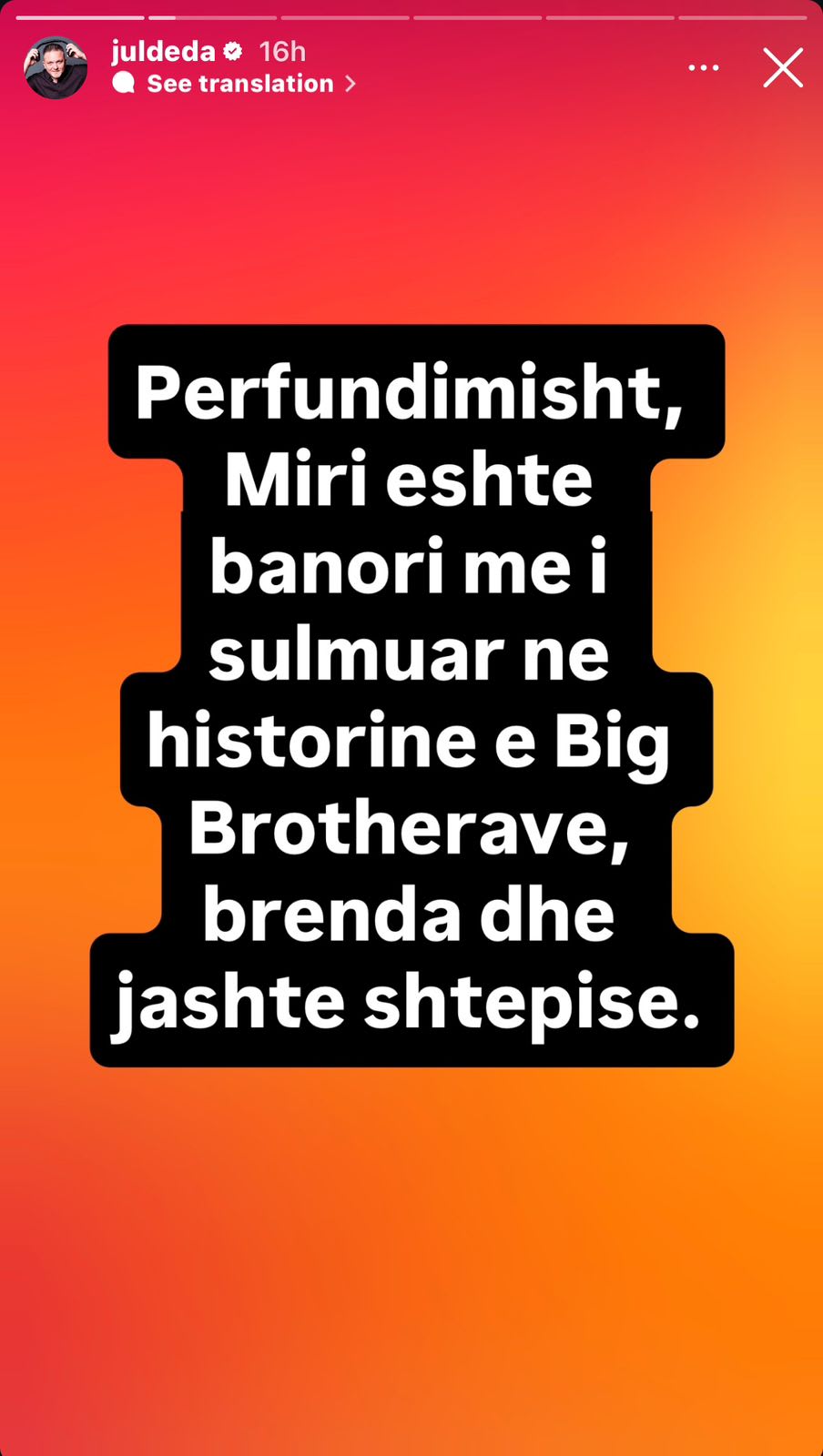“Pa dyshim, Miri është banori më i sulmuar në historinë e Big Brother-ave, si brenda ashtu edhe jashtë shtëpisë”, u shpreh ai.