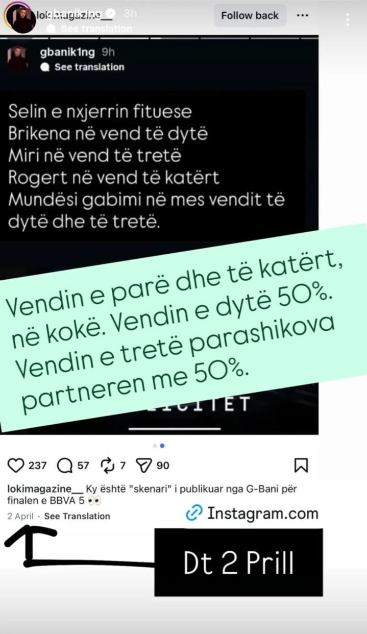 Përmes postimeve në rrjetet sociale, ai pretendon se rezultati ishte i paracaktuar, duke e cilësuar të gjithë procesin si një “skenar të menduar më parë”. Si “provë”, ai ka shpërndarë një publikim të bërë javë para finales, ku sipas tij kishte parashikuar renditjen e finalistëve, përfshirë edhe fitoren e Selinës.