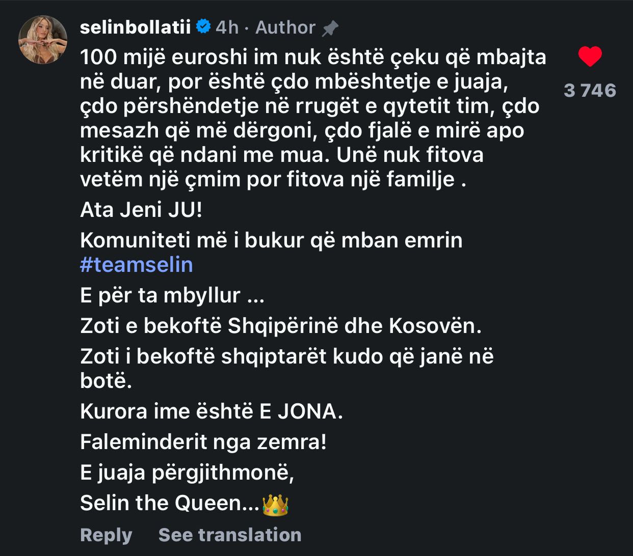 Pas finales së Big Brother VIP Albania, Selin Bollati ka bërë reagimin e parë publik, duke ndarë emocionet e saj dhe duke ndezur menjëherë rrjetin.
