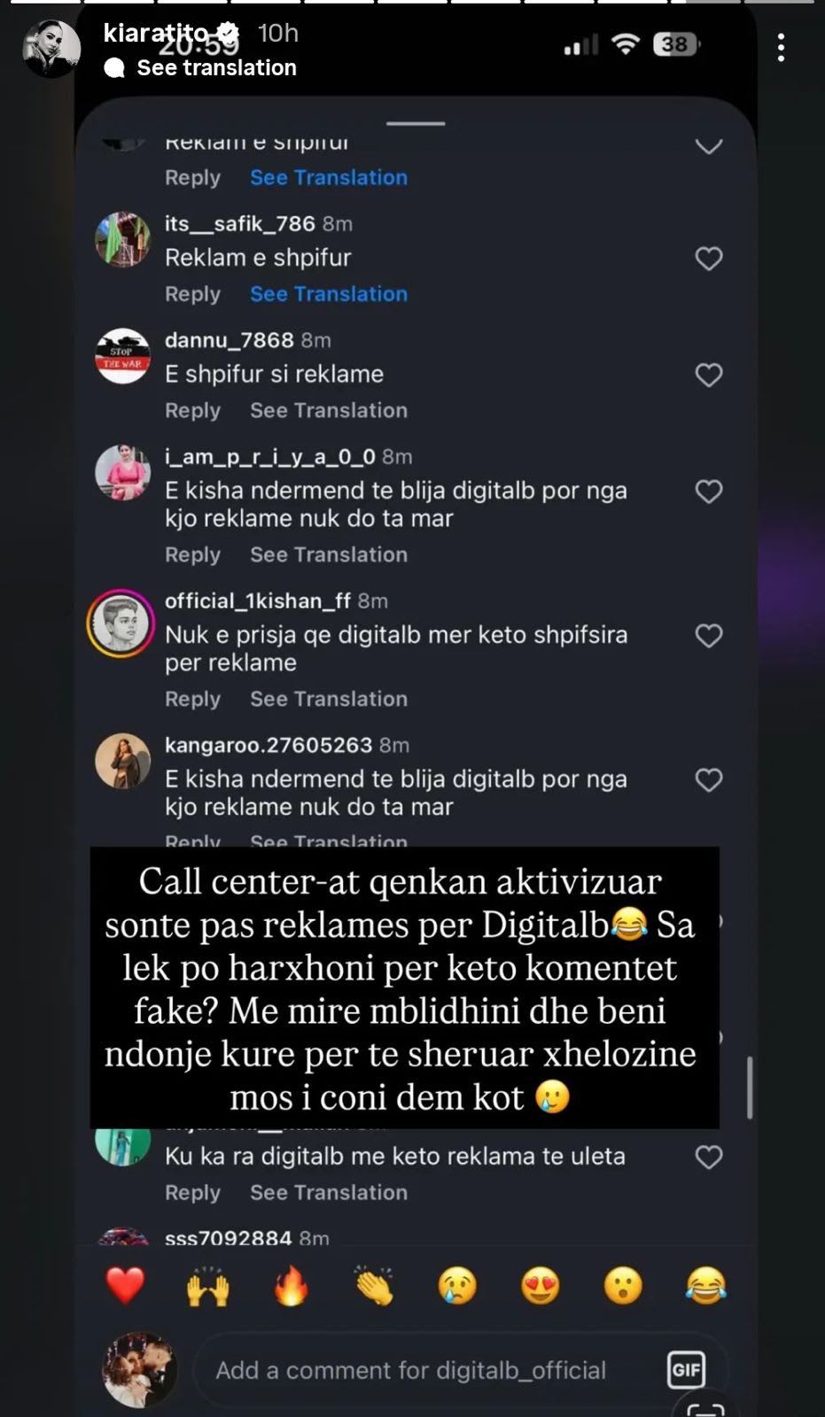 Nën postimin e saj kanë vërshuar komente të shumta kritike, ku disa përdorues kanë përdorur edhe fjalor ofendues ndaj moderatores dhe kompanisë. Megjithatë, Kiara ka vendosur të reagojë publikisht duke i bërë të dukshme këto komente.