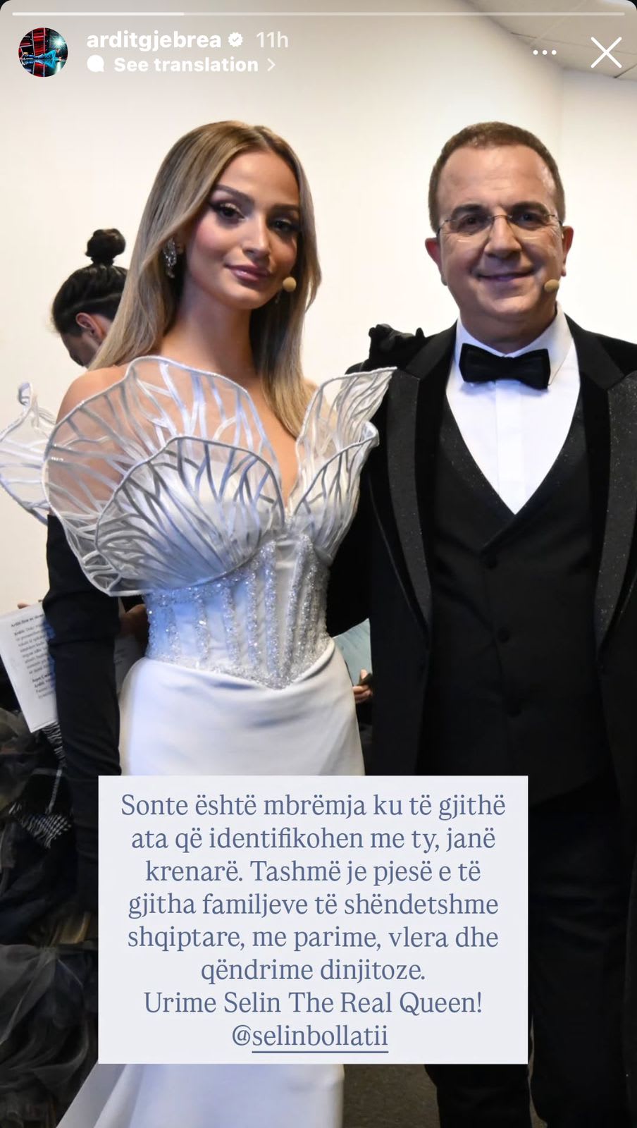 “Sonte është mbrëmja ku të gjithë ata që identifikohen me ty janë krenarë… Urime Selin The Real Queen!” – ka shkruar ai, duke e cilësuar atë si një model pozitiv për publikun.