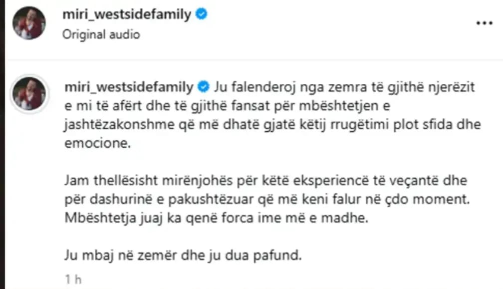 Miri, i njohur edhe si pjesë e grupit West Side Family, e mbylli reagimin me tone shumë emocionale: “Ju mbaj në zemër dhe ju dua pafund.”