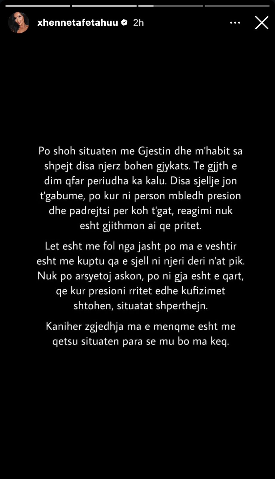 Ish-banorja e Big Brother VIP Kosova, e cila krijoi një raport të afërt me reperin gjatë qëndrimit në shtëpi, ka ndarë një mesazh në Instastory ku duket se i del në mbrojtje.